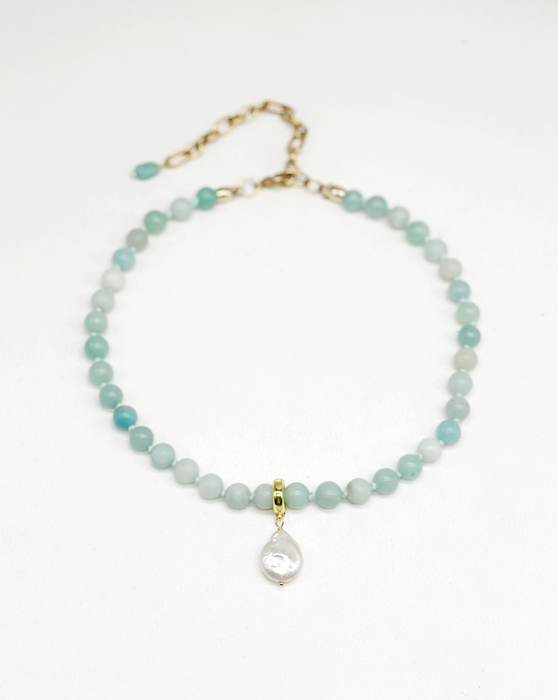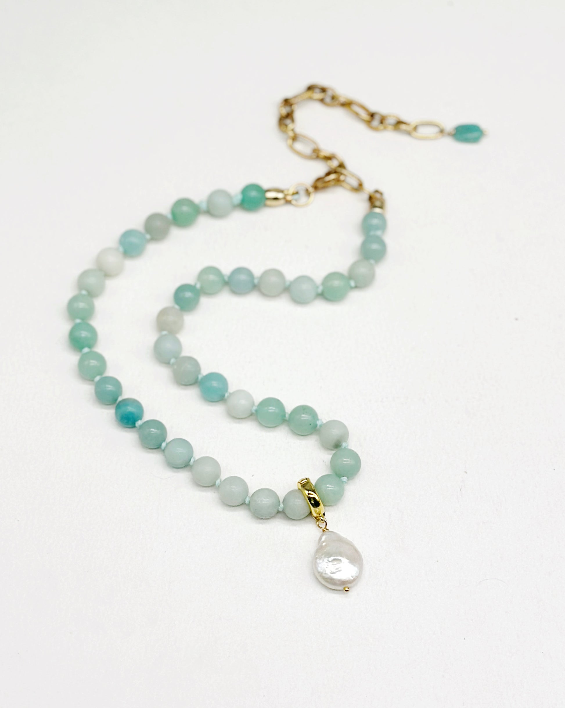 These Amazonite rounds are a soft, naturally stippled gentle minty green - they feel so calming to wear & suit all skin tones - she comes with a beautiful pearl drop that you can clip on and off - wear plain - or have some fun and clip on a mix of charms from our collection here: charms.