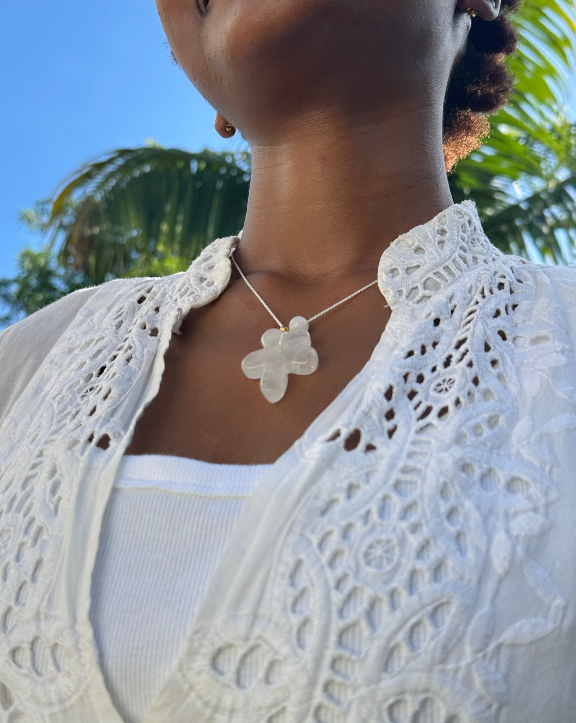 We’ve always loved weaving meaning into what we wear - this piece captures the luminous clarity of truth with a hand-carved Clear Quartz flower—symbol of renewal and inner light—suspended on silk and crafted with mindful intention. Its crystalline transparency reflects strength in stillness, amplifying energy and focus while inviting balance and grace.